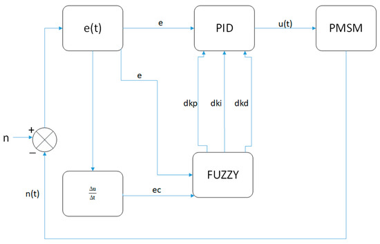 All the above control methods can deal with the nonlinear problem of EHA well, but each of them has certain defects. To solve the nonlinear problem of EHA and avoid the above defects, the fuzzy PID control method is introduced into this paper. Fuzzy PID control is a good tool to deal with complex, non-linear and uncertain systems [22]. In order to address friction, load and other types of non-linear disturbance factors and to increase the speed of the motor, this paper uses a fuzzy adaptive PID control model to simulate the EHA system.