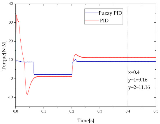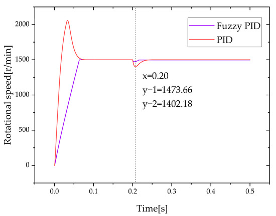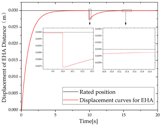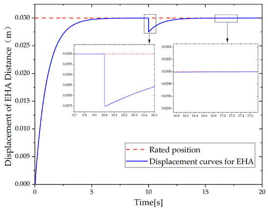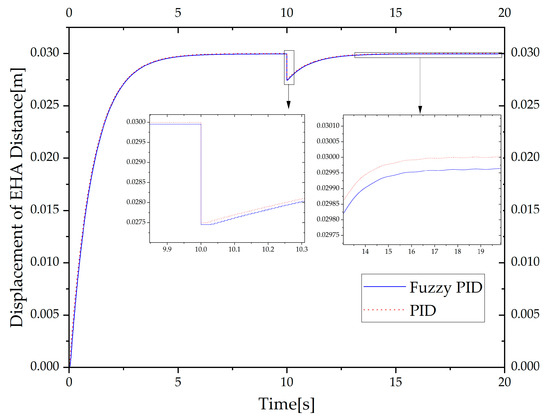 - Load disturbances were added to the simulation process to study the anti-disturbance of the fuzzy PID controller applied in the EHA. The results show that the fuzzy PID controller can still return the EHA to the specified position after being disturbed by the load and has good anti-disturbance.