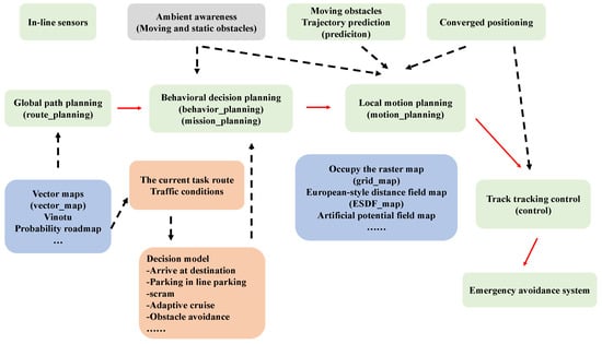 The core components of unmanned driving technology include perception, location, path planning, vehicle control, and scheduling. However, the driving conditions in a mine are different from those on typical road surfaces, and they have many drawbacks including heavy coal dust and inadequate lighting, which can easily result in poor perception accuracy. The smoothness of the driving road makes it difficult to precisely control the driving vehicles. The driving environment has the characteristics of being long and narrow, and signal transmission in the mining area is weak. Multi-vehicle transportation planning is inefficient, and information exchange is difficult. The following sections mainly discuss the different subsystems.