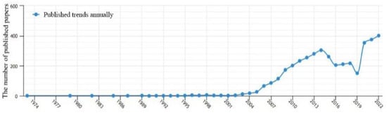 To proceed with the bibliometric analysis, papers published between 1973 and 2022 were collected which were correlated to the coal mine field greatly. The distribution of various types of publications over the studied period offers an overview of the progress made in this field. In this regard, the total number of published papers was analyzed and the results (Figure 6) suggest that the number of papers did not show much significant growth before 2004. However, after 2005 the number of papers increased rapidly, and now this trend still rises.