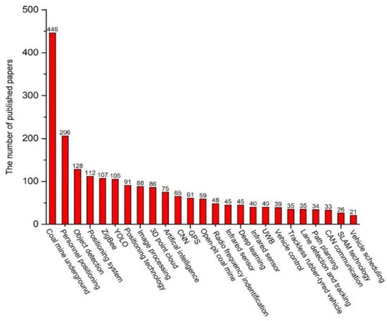 Our review paper is based on a comprehensive literature review and qualitative analysis rooted in creative coding. We decided to focus on the analysis of influential scholarly texts such as academic journal papers or theses. To identify texts, we employed the Scopus database, which is advertised as a daily updated ‘source-neutral abstract and citation database, curated by independent subject matter experts’. The search for relevant texts was carried out via two complementary paths; for both paths, ‘unmanned driving vehicle in coal mine’ remained the mandatory search term. One search employed keywords to search for relevant papers, which covered all publications using the keywords. It is worth noting that some papers appeared not to be relevant, and some of them had just the keywords provided by the authors of the published papers. Therefore, it was necessary to select some relevant papers for the topic again because there are too many unrelated papers after searching for the first time. The second method was more convenient; we searched for papers in the reference lists of downloaded papers, which was quicker for finding relevant papers. The number of published papers relevant to the various main themes were also counted, as shown in Figure 4 The most common research themes were the coal mine underground, personnel positioning, object detection, and so on. The other themes were less common, such as path planning, SLAM technology, and vehicle scheduling. However, as can be seen from Figure 5, more and more research is focused on the unmanned driving field.