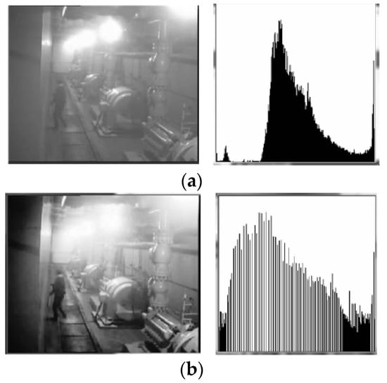 The contrast of the original data and the processed data. (a) The original image and corresponding histogram. (b) The image and histogram that are equalized by the histogram.