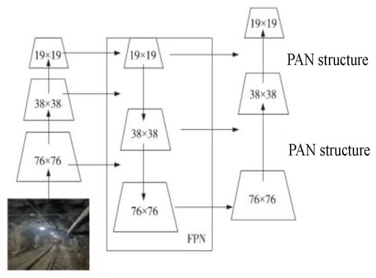 Insufficient lighting in coal mines, poor light stability, and the interference of coal dust and other factors mean that the detection features are prone to weak features. In response to the above problems, researchers have carried out effective processing from image preprocessing and detectors to achieve accurate detection of objects in mines. Xu et al. [] proposed an image preprocessing method for underground coal mines, aiming at the problem of image blur caused by low illumination and large dust interference in coal mines. The non-uniform distribution state of the level area is transformed into a uniform distribution state, which expands the dynamic range of the pixel gray value and effectively improves the visual effect of the image (Figure 6). In addition, some works are focused on the improvement of network architecture. Yu et al. [] used the latest target detection YOLOv5 model in coal mines, as shown in Figure 7. Based on the Neck layer, the FPN + PAN structure was used to accurately identify people, equipment, and gravel in the middle and on both sides of the track at different distances and positions. It accurately identified small target objects with low pixels in the well, achieving the purpose of early warning in the process of unmanned driving of electric locomotives, and improving driving safety.