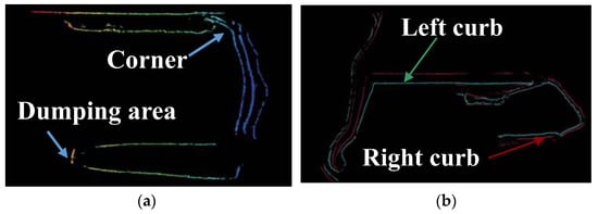 Because the camera is highly sensitive to light and can only detect the two-dimensional plane information of an object, it is difficult to collect depth information for that object. Therefore, the application of radar is gradually being popularized, and the radar-based method has the advantages of being able to distinguish the details of obstacles, accurate ranging, and not being affected by light conditions. Chen et al. [] proposed a Lidar-based road-edge detection and mapping scheme in mining areas, as shown in Figure 8. Through a variety of feature extraction algorithms, the road edge points are roughly obtained on the single-frame point cloud, and then using OctoMap to track the road edge, and finally they complete the construction of the road map of the mine area and achieve a better boundary between structured roads and unstructured areas. Although Lidar has more advantages in acquiring the pose and shape of the target, for the specificity of coal mining it is easy to lose point cloud, texture, and other information at close range.