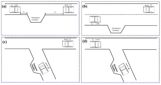 In the single-lane meeting scene (Figure 11a), if two vehicles meet in the driving process, the vehicles should analyze the distance to the emergency chamber. Then, the vehicle that is closer to the emergency chamber would drive into the chamber. The other vehicle would drive straigh on and away. In the dual-lane meeting scene (Figure 11b), the vehicle would drive directly with low speed. However, in the emergency state, if the two vehicles could not drive away, the vehicle that is closer to the emergency chamber would drive into the chamber for safety. In the intersection road environment 1 (Figure 11c), the vehicle on the straight road would drive directly on and away and the vehicle on the skew road would stay until the meeting vehicle drove away. However, if the vehicle on the straight road would turn left, the vehicle on the skew road would drive into the emergency chamber until the meeting vehicle drove away. In the intersection road environment 2 (Figure 11d), if the vehicle on the straight road drove directly on and away, the vehicle on the skew road would stay until the meeting vehicle drove away. However, if the vehicle on the straight road would turn right, the vehicle on the skew road would drive into the emergency chamber and wait until the meeting vehicle drove away.