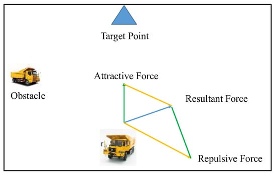 Unmanned mining vehicles are vulnerable to unforeseen barriers while operating, such as dynamic information like moving traffic and pedestrians. To increase driving safety, local path planning is done as soon as movement information is noticed. Good efficiency and high stability must be guaranteed by an acceptable local path-planning method. Artificial potential field algorithms including the A* algorithm are currently employed extensively in the mining industry. The artificial potential field algorithm among them searches for the best driving path to avoid obstacles within the scope of the potential field, but it is easy to fall into the local minimum. It creates an external force environment by establishing virtual potential fields such as the gravitational potential field of the target point and the repulsive potential field of obstacles, point flaws that make it challenging for the vehicles to keep moving. In order to overcome the drawbacks of the local optimal solution of the conventional artificial potential field algorithm, Zhang et al. employed the A* algorithm to build nodes beforehand and then applied the artificial potential field method between the nodes []. The concrete diagram is shown in Figure 12. Gu et al. generated a repulsive force potential field function to resolve the conflict between the repulsion force and the gravitational force, calculating the relative distance between the vehicle and the target location by introducing adjustment parameters []. Additionally, an APF-FC algorithm was suggested to address the issue that the algorithm has a tendency to quickly approach the local minimum point. This algorithm successfully addresses the shortcomings of the artificial potential field.