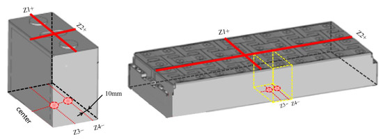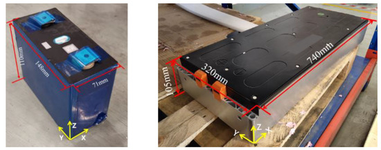 The experimental samples of the battery and module are shown in Figure 1. For the samples, the cathode material is lithium iron phosphate, the anode material is graphite, the nominal capacity is 120 Ah, and the size is 148 mm × 71 mm × 110 mm. The module consists of 10 batteries assembled in series into a module, and then two small modules assembled in parallel into a large module. To obtain the safety properties of the battery under extreme conditions, the SOCs of the test samples are 100%. The X, Y, and Z directions of the battery and module are defined according to the driving direction and the installation state of the battery in the vehicle, as shown in Figure 1. Z+ was defined as the direction of the electrode tab, with Z− being the direction of the “bottom” of the battery.