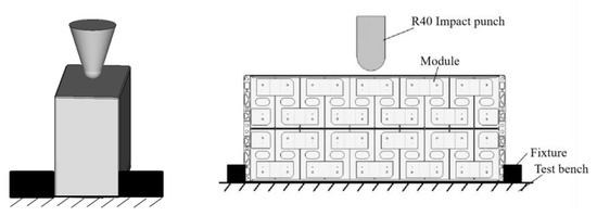 The battery pack, when placed at the bottom of the electric vehicle, typically receives no significant shielding from the ground. Therefore, the battery pack is prone to deformation during underpinnings or collisions [7,8]. Slight deformation may cause the capacity to decrease quickly and the micro internal short circuit [9,10]. Excessive deformation may cause a major short circuit inside the battery and result in a TR event. There are three main types of bottom collisions for electric vehicles: (1) a battery pack pierced by sharp objects on the road; (2) a foreign object stuck between the road and the battery pack; and (3) a battery pack impacted or extruded by foreign bodies directly [11,12,13]. The third form is more common than the first two. Currently, mechanical safety testing methods for batteries include three-point bending, extrusion, needling, and drop-weight tests [14,15,16]. Through three-point bending and static extrusion tests, the intrinsic safety characteristics of the battery can be studied intuitively. The drop-weight impact test can better simulate the dynamic damage behavior of the battery during the collision process. Xia et al. [17] conducted dynamic impact tests in different directions, with soft-pack batteries holding differing states of charge (SOC). The results showed that the load-carrying capacities of the modules in the X and Y directions were twice as high as the carrying capacity of those same modules in the Z direction, and the load-carrying capacity of the modules was stronger than that of the cells. Yang et al. [11] analyzed the key characteristics of foreign objects on the road and studied the deformation behavior of cells under quasi-static extrusion conditions. Chen et al. [18] conducted a dynamic impact study on square lithium-ion batteries and found that the indentation depth under dynamic impact conditions was much smaller than that under quasi-static extrusion. Sergiy et al. [19] studied the failure behavior of soft-pack batteries under high-speed impact with a cylindrical extrusion intender, indicating that the critical impact speed triggering TR of a typical soft-pack battery is 25 cm/s. Zhu et al. [20] studied battery failure behaviors during quasi-static extrusion with cylindrical and wedge-shaped punches, indicating that the main mode of battery failure caused by a cylindrical punch is extrusion, while a wedge-shaped punch results in shearing failures. According to previous research, it can be seen that the mechanical safety of battery packs is not only related to the extrusion speed and energy, but also related to the shape of the extrusion punch, the extrusion angle, and the extrusion position [21,22]. More effective protection methods and structural optimization methods require detailed study [23,24].