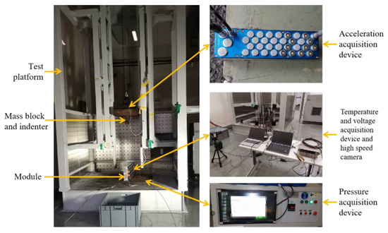 The above tests were carried out on the drop-weight test system, as shown in Figure 4. The test equipment includes the test platform, indenter, mass block, K-type thermo-couples, force sensor, and high-speed camera. The tests were carried out in free-falling impact mode. The effective impact height ranged from 0 to 3500 mm. Different impact energies were achieved by adjusting the mass block and impact height. Thermo-couples were used to monitor battery temperature. Voltage was monitored with a standard voltage sensor.