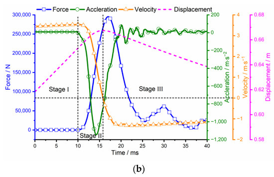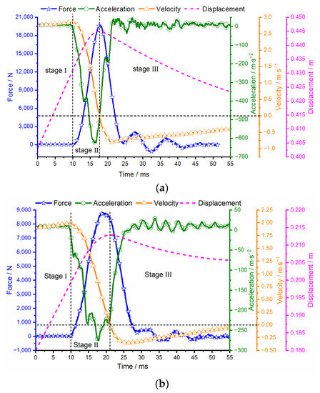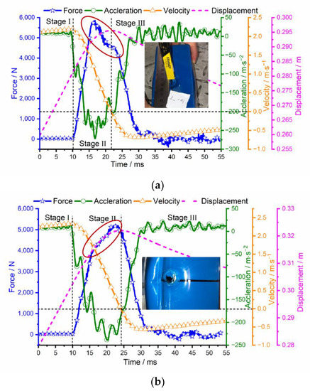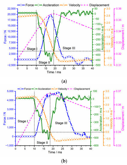 Drop-weight test results of the battery module at Z− directions. (a) Test results at Z3− position; (b) Test results at Z4− position.
