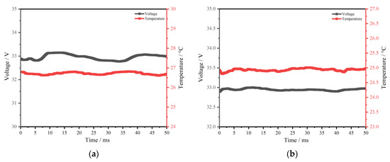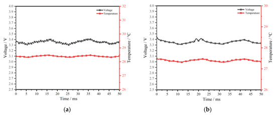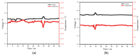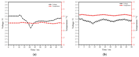 Figure 11 shows the voltage–temperature–time curve of the battery module after being impacted. By comparing Figure 11a,b, it can be seen that the voltage and temperature of the battery module jumped during both collisions. This can primarily be attributed to the deformation of the cell and the busbar in the module caused by the large extrusion area of the cylindrical impact head.