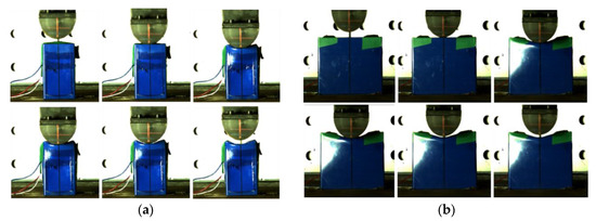 Figure 12 shows the test results of the battery module at the Z3− and Z4− positions. According to the displacement-time curve, the deformation of the battery module at the Z3− and Z4− positions are 15.1 mm and 14.1 mm, respectively, and the deformation rates are 13.5% and 12.6%, respectively. Similar to the extrusion results of the cells, the Z4− position of the battery module is more easily crushed. In the case of a 1 mm difference in deformation, the maximum forces by the battery module at the Z3− and Z4− positions were 19.7 kN and 4.9 kN.
