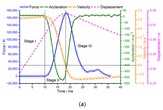 Figure 5 shows the Z+ test results. The velocity-time curve can be obtained by integrating the acceleration-time curve of the indenter. The displacement-time curve can be obtained by integrating the velocity-time curve. According to the curves in Figure 5, the dynamic impact process of the battery during blunt force impacts can be divided into three stages: initial contact stage, extrusion deformation stage, and rebound stage. At the beginning of the initial contact stage, the battery contacts the indenter, the force is 0, and the velocity of the indenter rises rapidly. Due to the gap between the battery, the ground, and the stiffness of the electrode tab, the battery is compacted at the beginning of the extrusion deformation stage. As the resistance of the indenter increases, the reverse acceleration increases first and then decreases. At the end of the extrusion deformation stage, the deformation of the battery reaches its maximum, and the velocity of the indenter decreases to 0 m/s. Due to the energy loss of the indenter, the deformation of the battery begins to rebound. During the rebound stage, the force decreases, the reverse acceleration decreases, and the reverse velocity increases. After repeated cycles in the rebound stage, the energy of the indenter is depleted and restored to a static state.