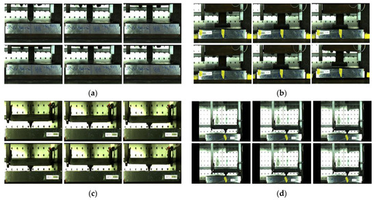 The dynamic impact process with different intenders. (a) Test process in the Z1+ orientation; (b) Test process in the Z2+ orientation; (c) Test process at the Z3− position; (d) Test process at the Z4− position.