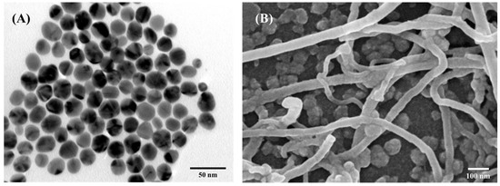 (A) TEM image for AgNPs; (B) SEM image for MWCNTs.
