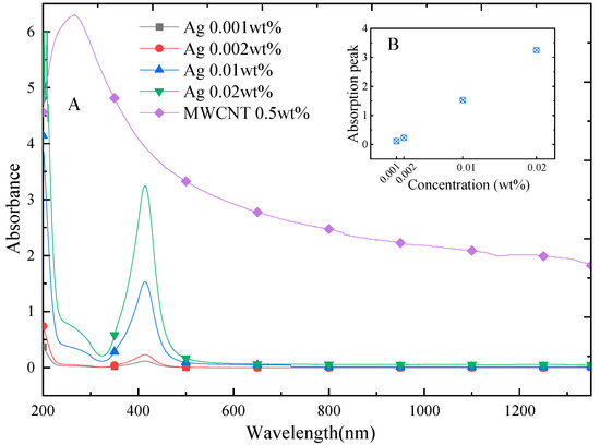 (A) Spectral-dependent absorbance of silver and MWCNT nanofluids under different volume fractions; (B) Absorption peak of silver nanofluids at different concentrations.