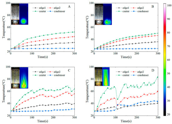 Temperature variations of the PHP with the filling ratio of 80%: (A–D) filling with DI water, 0.001 wt% AgNPs, 0.01 wt% AgNPs, and 0.02 wt% AgNPs nanofluid, respectively. The inset shows the photographs and infrared images 120 s after solar radiation.