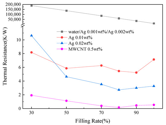 Figure 7 shows the thermal resistance of each concentration of nanofluid at different filling rates. For DI water and relatively low-concentration nanofluids, the PHP does not oscillate during the experiment as mentioned in Section 3.1. Therefore, the thermal resistance is calculated theoretically from the thermal conductivity of the working fluid and the results are relatively large. It can be seen from Figure 7 that the addition of nanofluid can significantly reduce the thermal resistance of the PHP. However, when the concentration of nanofluid is relatively low, the heat absorption of the evaporation section of the PHP is not greatly improved and the PHP cannot operate. By comparing Figure 7 and Table 1, it can be conclude that the thermal resistance of the PHP decreases with the improvement of photothermal conversion efficiency of the nanofluid.