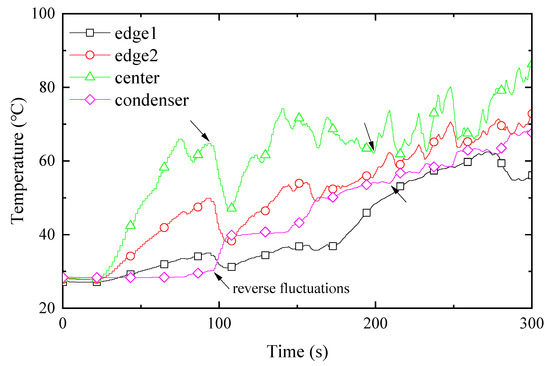In order to clearly observe the temperature fluctuation and quasi-sine oscillation, the results of the PHP filling with 0.5 wt% MWCNTs were selected for analysis. As shown in Figure 8, the temperature change curve of the four-part PHP shows obvious fluctuations. With the PHP operating, the temperature of edge1 is even lower than the condensation section after running for about 100 s, as a result of the light spot not completely covering the edge of the PHP. Taken together, the temperature fluctuation can be separated into small-amplitude irregular fluctuations and quasi-sine fluctuations. The reason for the small-amplitude irregular fluctuation is mainly the non-uniform and discontinuous small-amplitude oscillation in the tube. For the quasi-sine fluctuations, the accompanying reverse fluctuations between the evaporation section and the condensation section can be found (as marked by arrows in Figure 8). The reverse fluctuations could be attributed to the cycle in which the evaporation section absorbs heat to make the gas plug oscillate to the condensation section to release heat, which is the ideal operating condition of the PHP. The appearance of the reverse fluctuations indicates that the PHP has a good operating performance, and the working fluid has quasi-sine motion in most moments.
