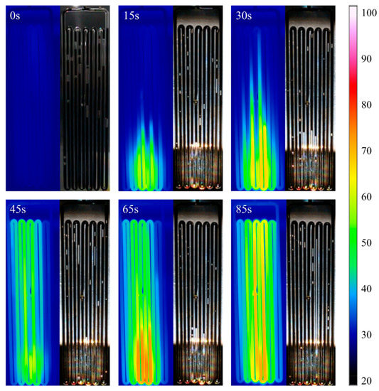 Combined with the infrared images, as shown in Figure 9, in the beginning, the temperature of the PHP is equivalent to the ambient temperature, around 25 °C. After applying sunlight, the evaporation section of the PHP begins to heat up. Because the spot area cannot cover the entire evaporation section, the temperature increases unevenly. After 30 s, the temperature in the evaporation section is already high, and the high-temperature zone begins to extend to the condensation section. Then, 45 s later, the temperature of the evaporation section decreases, and the condensation section begins to show a large temperature rise, which indicates that part of the working fluid in the evaporation section has flowed to the condensation section. The temperature of the evaporation section continues to rise at 65 s. Then, the working fluid flows to the condensation section again after 20 s, causing the temperature of the evaporation section to decrease. The operating temperature of the PHP acted in a quasi-sine oscillating mode. This phenomenon can also be observed in temperature variations of the PHP, as shown in Figure 9. Although the temperature of the PHP continues to rise due to the natural cooling method, it can still be seen that its temperature curve, especially the curve of center temperature, is similar to a quasi-sine oscillation.