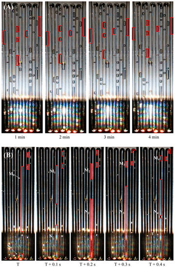 - The gas plugs of the DI water hardly move. As shown in Figure 10A, even if the time scale is extended to minutes, the gas plug distribution in the PHP is almost unchanged. From 1 min to 4 min, there is indeed a displacement of the gas plugs. However, the displacement is extremely small, and no sudden acceleration of the gas plugs can be seen in the video. The average velocity of the gas plugs is approximately , which is almost negligible. The lack of working fluid flow in the PHP greatly limits its heat transfer performance. However, for the nanofluid, the gas plugs move violently. The gas plugs moving speed can reach 0.55 m/s.