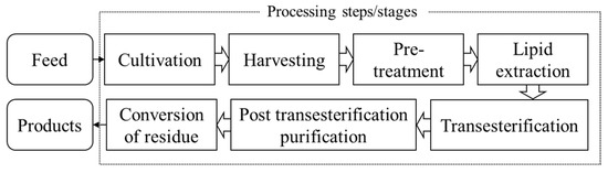 The biochemical composition represents the fate of its application in bioenergy [18]. As a raw material, lipids of microalgal biomass are employed, while residual biomass rich in carbohydrates can be also used as a raw material for bioenergy or biofuels production [18]. Moreover, considering all the possible biomass, crude bio-oil can be directly obtained via different methods of thermochemical conversion [18]. Figure 1 denotes the general processing route for producing bioenergy from microalgal biomass. The proposed superstructure is developed on the following eight major processing steps/stages [22], as shown in Figure 2. More details, such as the physical descriptions of all the technological alternatives considered in this work, can be found in the work of Rizwan et al. [22].