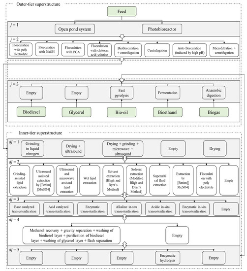 The proposed two-tier superstructure is built to divide the whole processing pathways into two small-scale configurations, with the simultaneous consideration of the biodiesel and microalgae residue made into a set of available products, as shown in Figure 3. A processing stage consists of the boxes in a row and a box represents a technological alternative. The indexes j and dj denote stages in outer- and inner-tier superstructures, respectively. For example, four technological alternatives are involved in the pre-treatment stage of inner-tier superstructure, which consists of the whole set of drying, grinding, microwave, and ultra-sonication [22]. The other option is represented by an empty box as the pre-treatment stage can be bypassed totally [22].