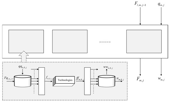 • Mixing happens in the inlets of each technological alternative, so that the flow of component m provided to technological alternative k of stage j is provided by mixing streams F q l , m , j 1 and q q m , k , j , which is expressed in Equation (7);