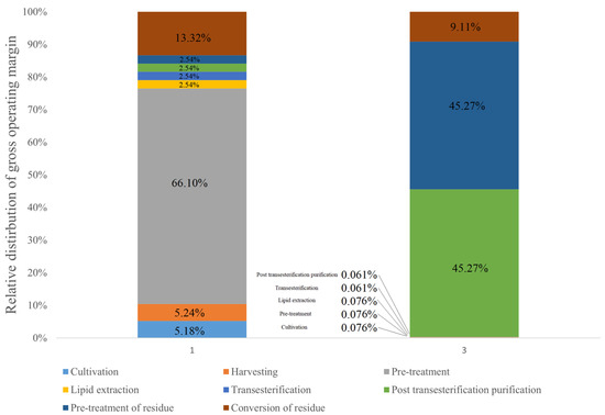 Rizwan et al. [22] declared that pre-treatment of biomass was commonly necessary prior to the lipid extraction stage to obtain lipids but this needs an inlet of crucial chemicals/solvents. Thus, the interesting share in this paper is the high cost of pre-treatment in Scenario 1. However, the distributions of stage-wise gross operating margin are shown in Figure 7 to relate to the total sales and the operating cost. The proportion in pre-treatment denotes that the total sale is much greater than the operating cost in this stage. It is also noted that the gross operating margin in this stage is calculated by the stored chemicals/solvents which are provided for the previous stages to achieve various products [22]. Therefore, the costs of the stored chemicals/solvents are calculated as that of the technological alternative in this empty box. The higher gross operating margin is provided in post-transesterification purification of Scenario 2. Higher methanol/lipids ratio is required in the post-transesterification purification, so that this operating cost is generally made higher, while the stored chemicals/solvents in this stage provide more highly economic-oriented pathway alternatives.