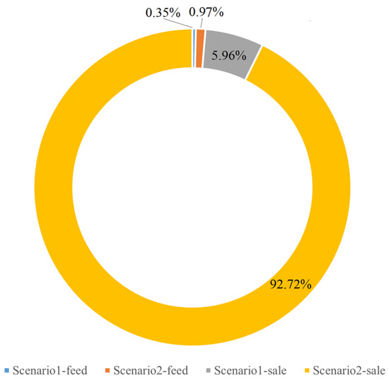 The distributions of stage-wise sum of stream flows for two scenarios is shown in Figure 8. The main bound for restricting the overall pathway is composed of the feed and the sale. The flows in the sale of Scenario 2 are highlighted as the fixed values in the yield of the final products no longer affect the optimization in the processing pathway. Thus, these technological alternatives in Scenario 2 are selected due to their higher flow for productions. To compare with Scenario 1, the optimized solutions in Scenario 2 feature a product yield increase up to 25% and a gross operating margin increase up to 27.09%. However, in contrast to Scenario 2, the industrial implementation in Scenario 1 is assessed directly since the yield of the final desired products is simulated as the specific market demand, while the specified products are also to avoid the unclear processing of microalgae residue from a biological perspective. Thus, the flows of the raw material, the cost distribution in each stage, and the overall operating cost are optimized under the specific constraints in Scenario 1.