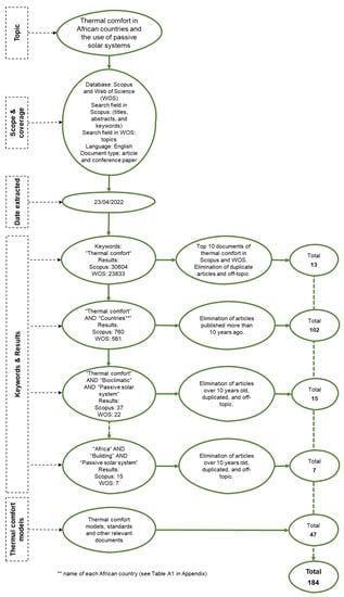 This review process is illustrated in Figure 1, in which the general theme is passive solar systems for thermal comfort in African countries, with a literature search carried out in Scopus and Web of Science (WOS) conducted on 23 April 2022.