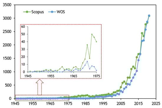 Based on a literature search conducted in Scopus and WOS on 23 April 2022, this article discusses passive solar systems with a focus on African countries. Using the keyword “Thermal Comfort”, 30,604 articles were found in Scopus and 23,833 in Web of Science. Figure 2 shows that the topic of thermal comfort has been studied since the mid-twentieth century, but it began to have a greater expression in 1969 with 12 articles found in Scopus and five in WOS, which coincides with the publication of Fanger’s static thermal comfort model. However, it is evident that there has been a significant increase in publications over the last 20 years (Figure 2), thus suggesting a growing interest in the subject, possibly related to the concept of sustainable development and construction defined in Agenda 21 of the CIB.