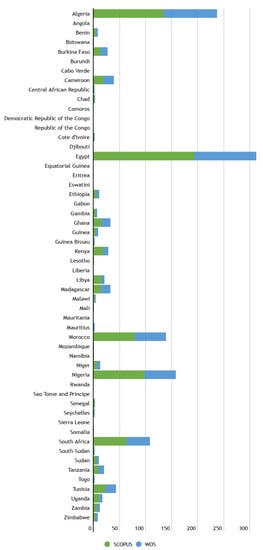 After this initial research, the search procedure with the keyword “Thermal comfort” was added, with the name of each of the 54 African countries and the previous names of those that changed their name since 1957 as the second keyword. Figure 3 (Appendix A, Table A1) shows the number of documents per country (keywords).