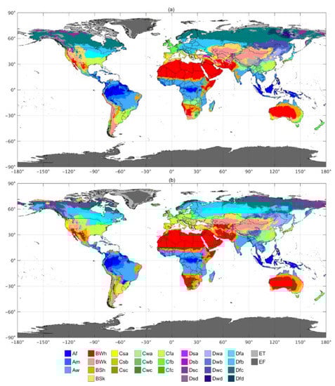 Update, presented by Hylke E. Beck et al. [46], on the climate classification maps of Köppen–Geiger. (a) displays the current map for between the years 1980 and 2016 and (b) the projections for the years 2071 to 2100.