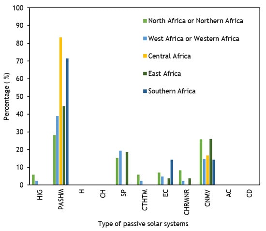 As mentioned before, the objective of this study was to show how thermal comfort using passive solar systems in African countries is considered. Articles from the last 10 years as well as the most relevant case studies from the previously identified countries (Appendix A, Table A2) were analyzed and categorized according to bioclimatic architecture construction strategies: heating internal gains, passive and active solar heating and materials, humidification, conventional heating, solar protection, cooling through a high thermal mass, evaporative cooling, cooling through high thermal mass with nocturnal renovation, cooling through natural and mechanical ventilation, air conditioning, and conventional dehumidification (adapted by Manzano-Agugliaro et al. [6]). In Appendix A, Table A2 presents the most relevant articles identified on African countries and study topics according to the previously defined categories in: North Africa or Northern Africa; West Africa or Western Africa; Central Africa (Middle Africa, or also Equatorial Africa); East Africa; and Southern Africa.