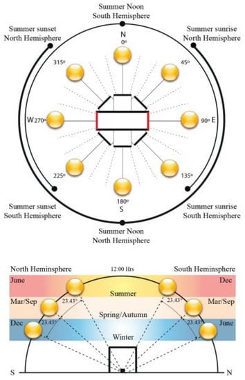 The proper orientation of the building consists in avoiding insolation impacts during the summer and capturing the energy of the sun during the winter. Thus, longer façades oriented towards the underheated period result in improved daylight during the heating season, while the shorter façades towards the overheated period control excessive insolation during the cooling season. The smaller the surface area exposed to solar radiation, the greater the energy reduction for cooling is. Notably, the exposure of each façade to the sun in each hemisphere was different. Façades facing south in the Northern Hemisphere and those facing north in the Southern Hemisphere can be reached by the highest altitude of the sun during the cooling season and the lowest altitude of the sun during the cooling season [54], as illustrated in Figure 6.