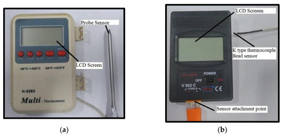 To measure the temperature of the test liquids during the experiment two thermometers were used. One of the temperature-measuring devices was the Multi-Thermometer H-9283. It has a sensor inside the stainless steel probe. It has a temperature range from −50 ℃ to 300 ℃. It has an LCD screen to display the temperature. It has temperature accuracy of 1 °C from −50 °C to 200 °C. The other temperature measuring device was a V902C digital thermometer which uses a K type thermocouple to measure the temperature. It has a temperature range from −50 °C to 1200 °C. The images of both the temperature-measuring devices are shown in Figure 4.