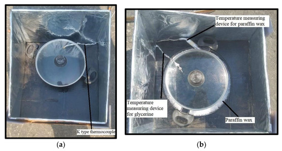 (a) Experimental setup on day 1 without the paraffin wax. (b) Experimental setup on day 3 when paraffin wax is used to collect data to find improvement in the thermal efficiency.