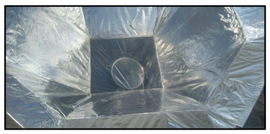 The transparent lid of the solar cooker is placed on the top of the box, and then, the funnel of the solar cooker is placed on top of the box, as shown in Figure 6.