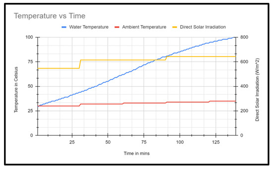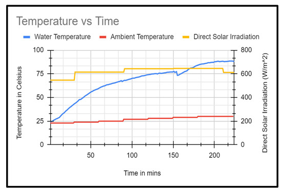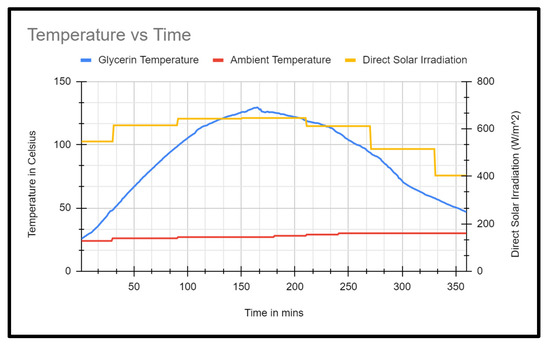 The experiments were conducted over a period of five days. Data was collected to find performance parameters such as the thermal efficiency and figure of merits and COR (cooker opto–thermal ratio)-dependent parameters such as the maximum achievable temperature reference time to reach that temperature and break even period of the solar cooker. Glycerine was used as a test load to collect the values to calculate the thermal efficiency, and water was used to collect data to calculate the figure of merit.