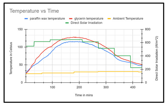 Temperature and irradiation values from day 3 using glycerine as test load and paraffin wax as heat storage material.