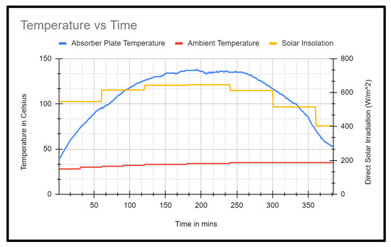 where is the first figure of merit, Tps is the maximum absorber plate temperature under no load condition, is the ambient temperature and is average solar irradiation. On substituting the values from day 4 of the experiment in Equation (1), we get is 0.14.