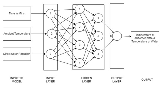 The artificial neural network models can be separated into two stages. First is the learning stage and second is the testing stage. The network in the learning stage makes errors and learns from them by adjusting the weights and biases to properly predict the correct or actual class label of the input tuples. For example, Input data has three features: Time in mins, Ambient Temperature in Celsius and direct solar radiance in W/m2, during the training phase data features are presented to the network one at a time and the biases and weights associated with the input values are adjusted each time. For most regression problems, the Mean Squared Error (MSE) is the loss function used for this model. For a single example, MSE is calculated by determining the difference in error between the calculated output by the model and the output prediction that is provided. Then, square the obtained error. The optimizer used is Adam, which also has a backpropagation parameter.