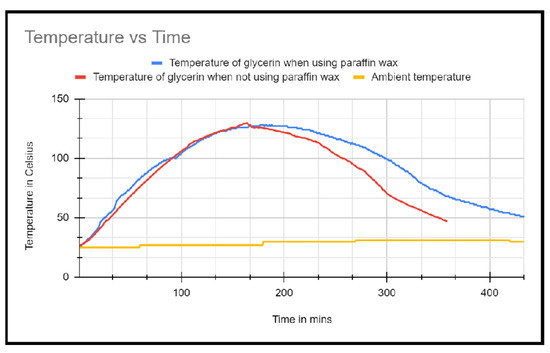 Time vs. temperature plot of glycerin when using paraffin wax and not using paraffin wax.