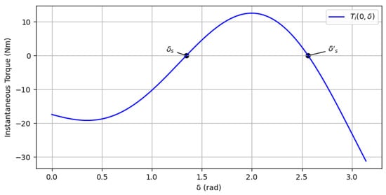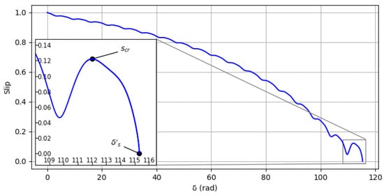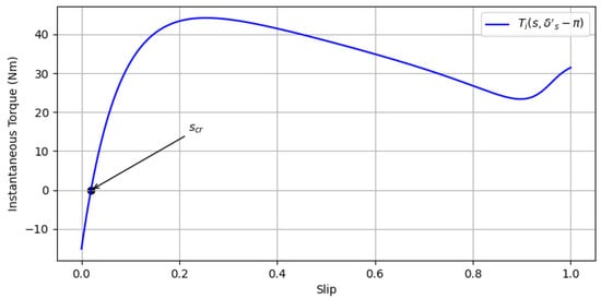 The treatment of (3) by Rabbi et al. [] is focused around approximating the last pole slip of the instantaneous torque. Initially, slip is set to 0, with the aim of solving the equation . For a majority of cases, this results in two solutions as shown in Figure 4, namely the load angle that is the load angle for which the motor reaches synchronous speed for the first time, and that binds the domain in which the critical slip will be found. The critical slip is the local maximum situated between and .