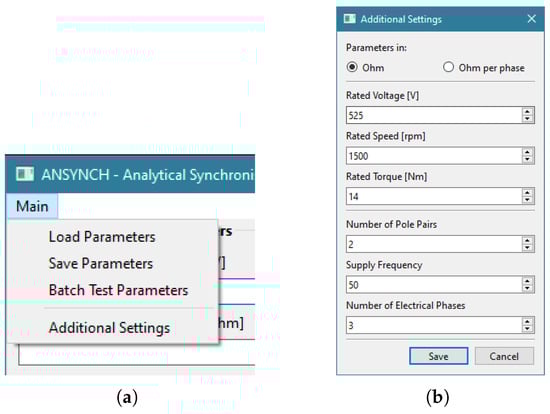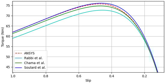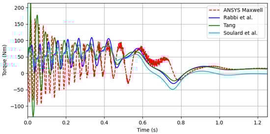 Three different equations selected for comparison are from Soulard et al. [], Rabbi et al. [], and Chama et al. []. The required machine parameters for the analytical cage torque curve are extracted from the ANSYS RMxprt and summarized in Table A1.