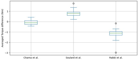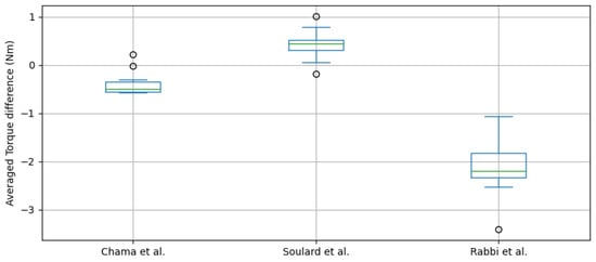 Box plot of average torque difference of various (Rabbi et al. [], Chama et al. [], Soulard et al. []) analytical equations from target for the region for the design set.