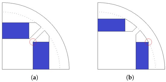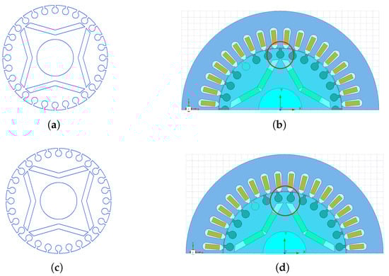 One of such cases is demonstrated in Figure 13, where Figure 13a,c display two RMxprt LSPMSM designs with the only difference of 0.01 mm in PM thickness. While the RMxprt model layouts look identical, the respective Maxwell-2D FEM models seen in Figure 13b,d distinctly vary, as the red circles highlight. Clearly, for the 4.58 mm case, the cage slot was accidentally shifted by 1-slot pitch.