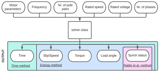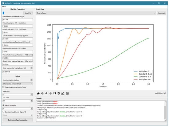 Determining whether a LSPMSM candidate design synchronizes usually requires transient finite-element (FE) analysis, which is computationally expensive and not suited for use in any iterative design optimization procedure [,,]. As an alternative, various fast analytical approaches for the synchronization analysis of LSPMSMs have been proposed such as energy methods [,], time-domain method [], semi-numerical method [], multi-damping-circuit model [], reluctance network model [], and sizing equation based mathematical model [], which promise to provide at least a good estimate of a design’s synchronization capability. The work reported in [] was probably the first attempt of incorporating both analytical steady-state and synchronization analysis into the multi-objective design optimization process of LSPMSMs. However, the optimization was conducted using the Taguchi method. Apart from that, these analytical approaches are only captured in literature with hardly any practical implementation in LSPMSM designs. Since both transient and steady-state operations need to be considered in the design of LSPMSMs, there is clearly a need to develop a transient synchronization analysis tool that can be integrated into mainstream electromagnetic simulation software.