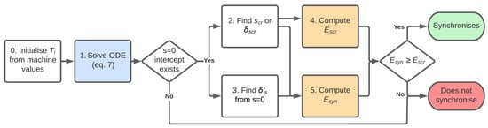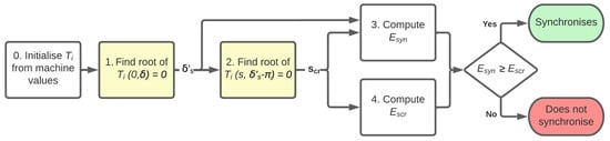 Then, using the value found for , the last pole slip is approximated as in order to find . Mathemtically, this is conducted by solving as shown in Figure 5. With and acquired, the required kinetic energy to pull the motor into synchronization is calculated using (4).